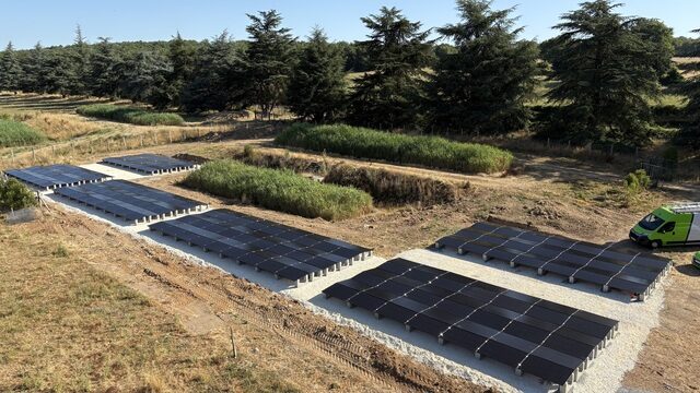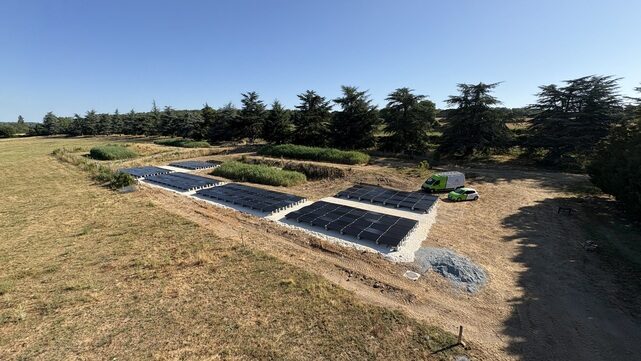 En complément de la centrale hydroélectrique de l’Abbaye, qui n’est pas toujours en mesure de répondre à nos besoins en été quand il n’y a pas beaucoup d’eau dans la rivière, nous installons un peu plus de 500 m² de panneaux photovoltaïques, en autoconsommation pure, sur la parcelle dédiée aux bassins filtrants plantés de roseaux de notre système d’assainissement (dans l’environnement protégé de l’église abbatiale, il n’est pas possible d’installer des panneaux en toiture).