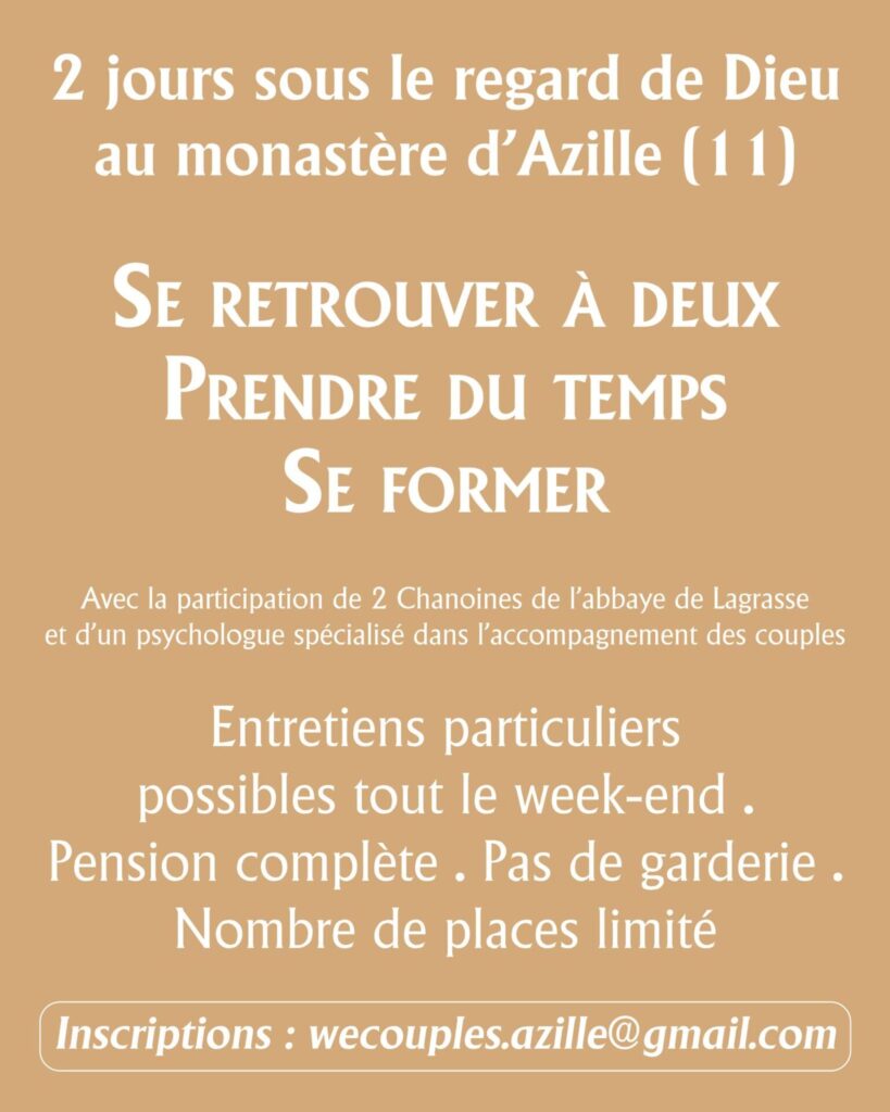 Accueil » Nos archives » [Agenda] WE pour couples les 4 et 5 octobre à Azille (11) Summorum Pontificum [Agenda] WE pour couples les 4 et 5 octobre à Azille (11) Les Chanoines de Lagrasse propose un WE pour couples mariés à Azille les 4 & 5 octobre : Abbaye Sainte Matrie de Lagrasse (Facebook) Article précédentColombie : la justice exige de l'Eglise la transparence sur des milliers de prêtres auteurs d'abus Article suivant9è dimanche après la Pentecôte 9 août 2025