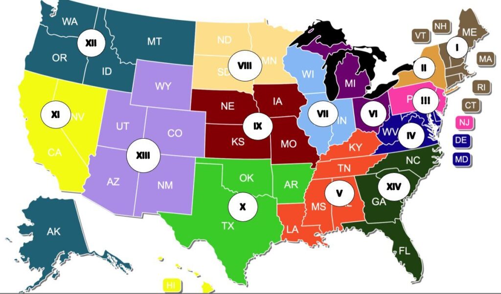 Les diocèses des différents États américains sont regroupés dans 14 régions territoriales plus une 15ème