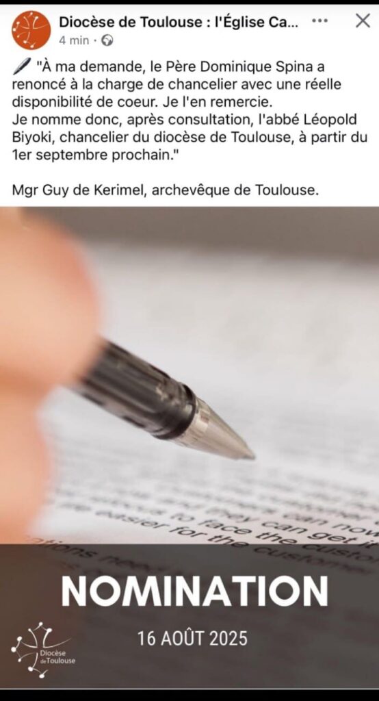 Le bon sens a fini par gagner à Toulouse – ce 16 août Mgr de Kerimel renonce à nommer l’abbé Spina, condamné pour viol sur mineur il y a 30 ans, comme chancelier, et entérine la nomination de l’abbé Léopold Biyoki à sa place.