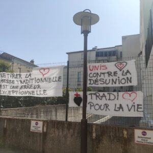 Devant l’église Notre-Dame, une tente sur le parking et des banderoles « nous sommes pas des pantins mais des chrétiens », « unis contre la désunion », « retirer la messe traditionnelle est une erreur exceptionnelle « .