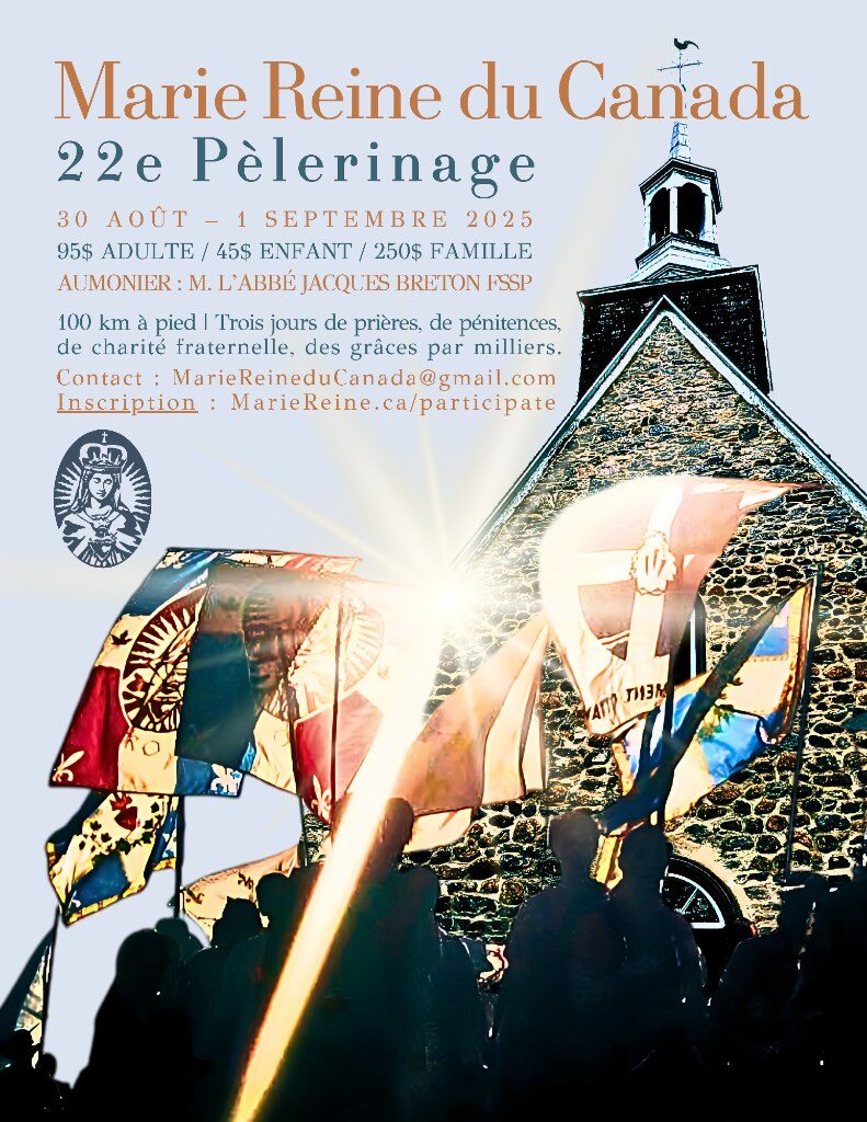 Du 30 août au 1er septembre aura lieu le 22è Pèlerinage Marie Reine du Canada de Saint Joseph de Lanoraie à Notre-Dame du Cap (Québec) à pieds (100 km). L’aumônier est l’abbé Jacques Breton, FSSP.