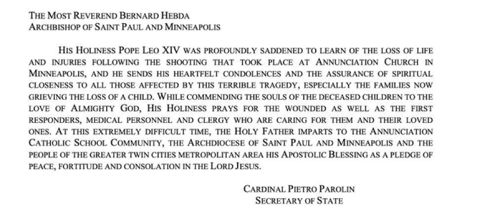 Le pape a envoyé un message de condoléances à l’archevêque de Saint Paul et Minneapolis, Mgr Anthony Hebda: