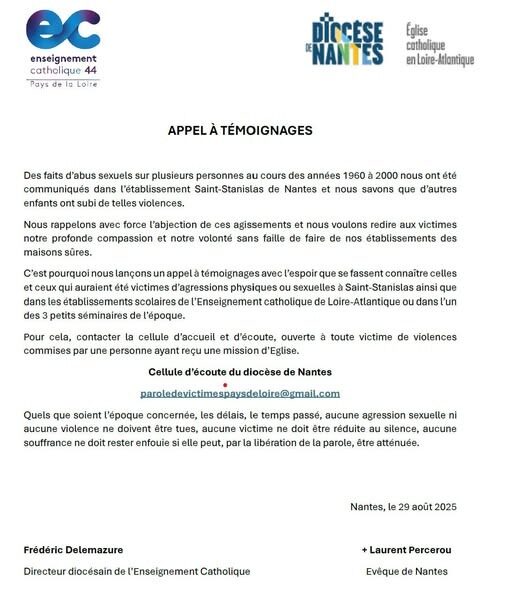 « Ce vendredi 29 août 2025, Mgr Laurent Percerou, évêque de Nantes et Mr Frédéric Delemazure, directeur diocésain de l’Enseignement catholique ont réuni les journalistes en conférence de presse afin de leur communiquer des informations concernant des faits d’abus sexuels (commis dans la période 1960-2000) dans l’établissement scolaire Saint Stanislas à Nantes. Tous deux ont rappelé avec force l’abjection de ces agissements et ont voulu redire aux victimes leur profonde compassion et leur volonté sans faille de faire de ces établissements scolaires des maisons sûres ».
