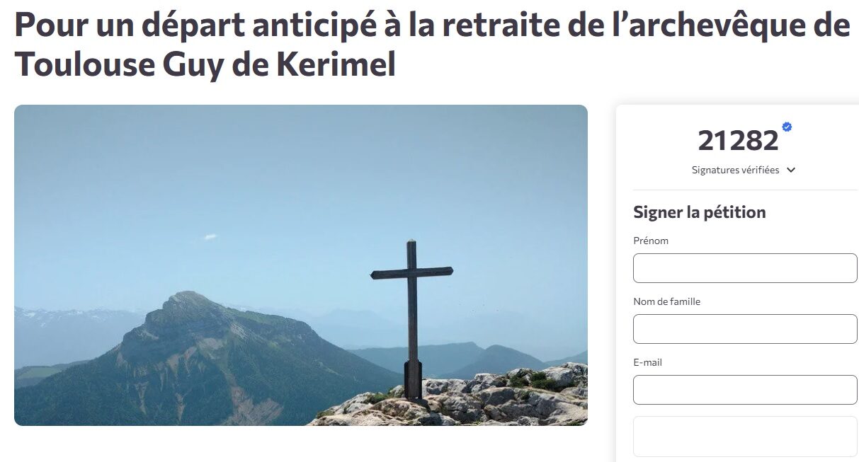 La pétition du collectif P.A.I.X pour envoyer Mgr de Kerimel en retraite anticipée après l’affaire Spina prend de l’ampleur : ce sont plus de 21.000 personnes qui l’ont signée. Pour rappel, Mgr de Kerimel a nommé un prêtre condamné pour viol sur un adolescent comme chancelier et s’est obstiné six longues semaines à le maintenir en poste, déroulant une conception totalement viciée et laborieuse de la miséricorde, de la justice restaurative, ou de l’écoute des victimes. Ce qui a provoqué de nombreuses réactions, notamment de la CEF, fait historique s’il en est.