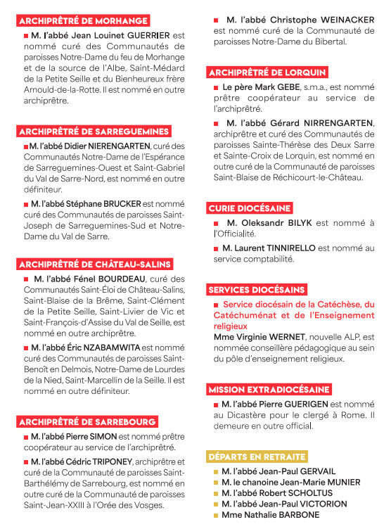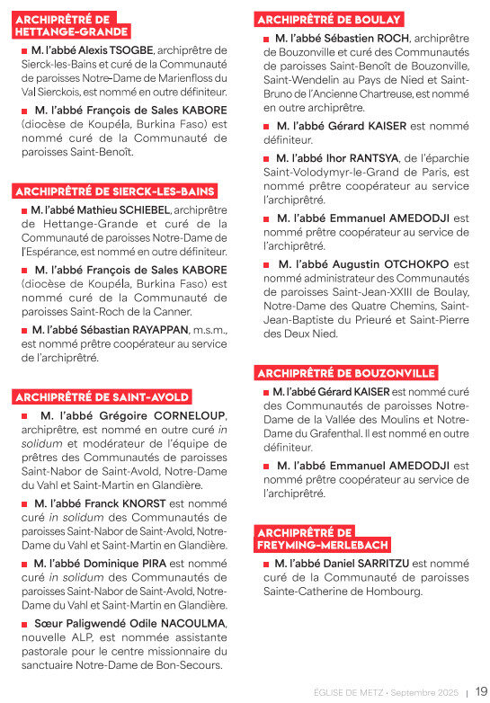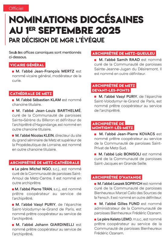 « Par décret du Premier ministre, M. François Bayrou, et du ministre d’État, ministre de l’Intérieur, M. Bruno Retailleau, en date du 10 juillet 2025, la décision par laquelle l’archevêque-évêque de Metz, Mgr Philippe Ballot, nomme M. l’abbé Jean-François Mertz en qualité de vicaire général, est agréée. M. l’abbé Jean-François Mertz occupe actuellement la fonction d’archiprêtre de Metz-Cathédrale et de curé modérateur des communautés de paroisses de l’archiprêtré, ainsi que celle de directeur de l’Institut Saint-Nicolas »