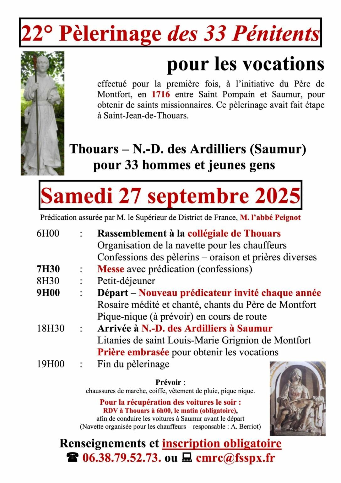 Le Pèlerinage des 33 Pénitents pour les vocations de Thouars à Saumur aura eu lieu le samedi 27 septembre. La prédication sera assurée par l’abbé Peignot, supérieur du District de France de la FSSPX.