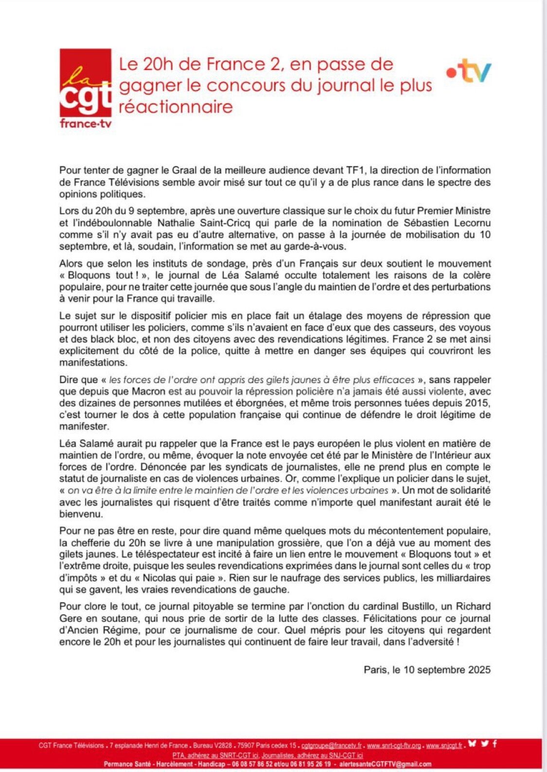 ⚡️ « Félicitations pour ce journal d’Ancien Régime » : La CGT France Télévisions s'indigne après l'invitation du cardinal Bustillo et du traitement en amont des mobilisations d'extrême-gauche du 10 septembre, au JT du 20h de France 2, présenté par Léa Salamé. pic.twitter.com/Mu1zJEg4yi