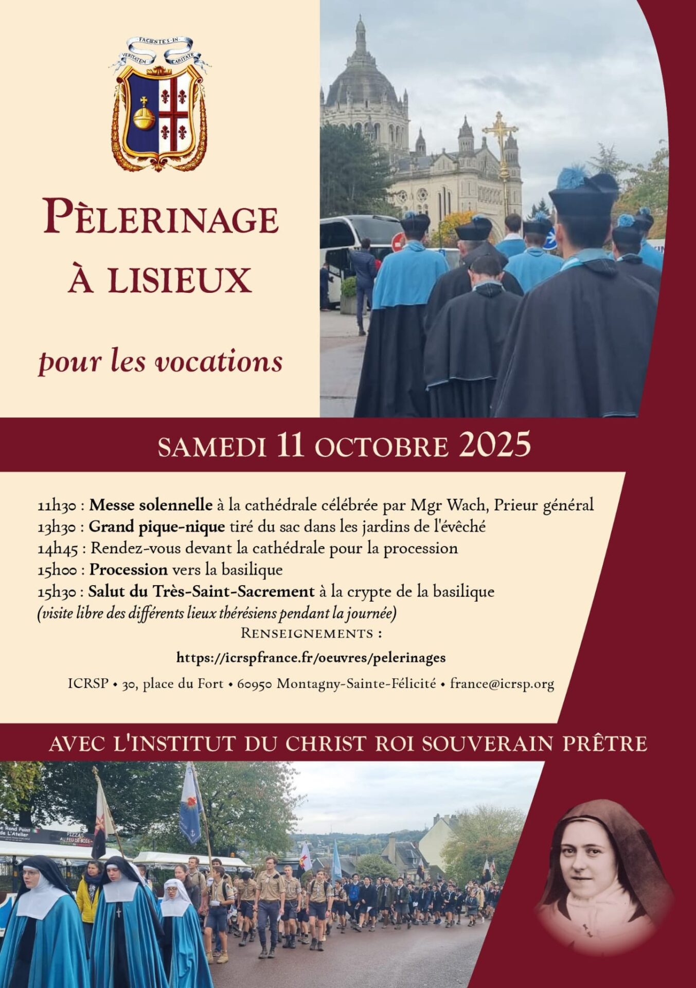 Accueil » Nos archives » Pèlerinage de l’Institut du Christ Roi pour les vocations à Lisieux le 11 octobre En Une Pèlerinage de l’Institut du Christ Roi pour les vocations à Lisieux le 11 octobre L’Institut du Christ Roi organise un Pèlerinage pour les vocations à Lisieux le samedi 11 octobre : ICRSP Pèlerinage Article précédentMesse de requiem à Saint-Roch pour le cardinal Vingt-Trois ce mardi 16 septembre Article suivantCe cardinal qui fait la fierté de la Corse 16 septembre 2025