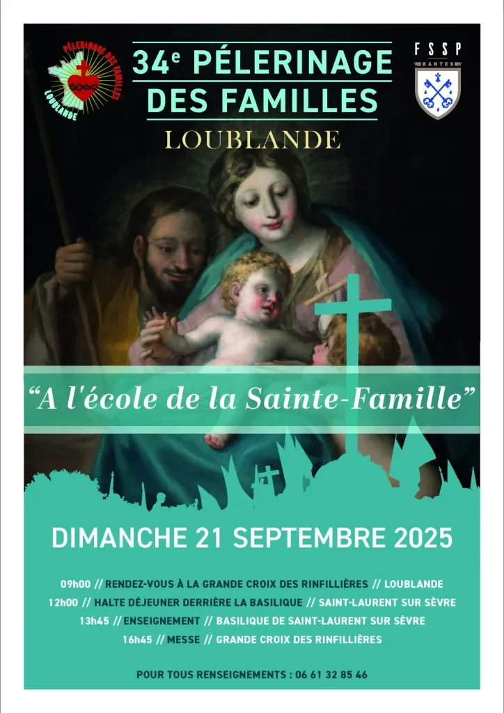 34è édition du Pèlerinage des familles à Loublande le dimanche 21 septembre 2025. L’aumônerie est assurée par la Fraternité Saint-Pierre (Nantes).