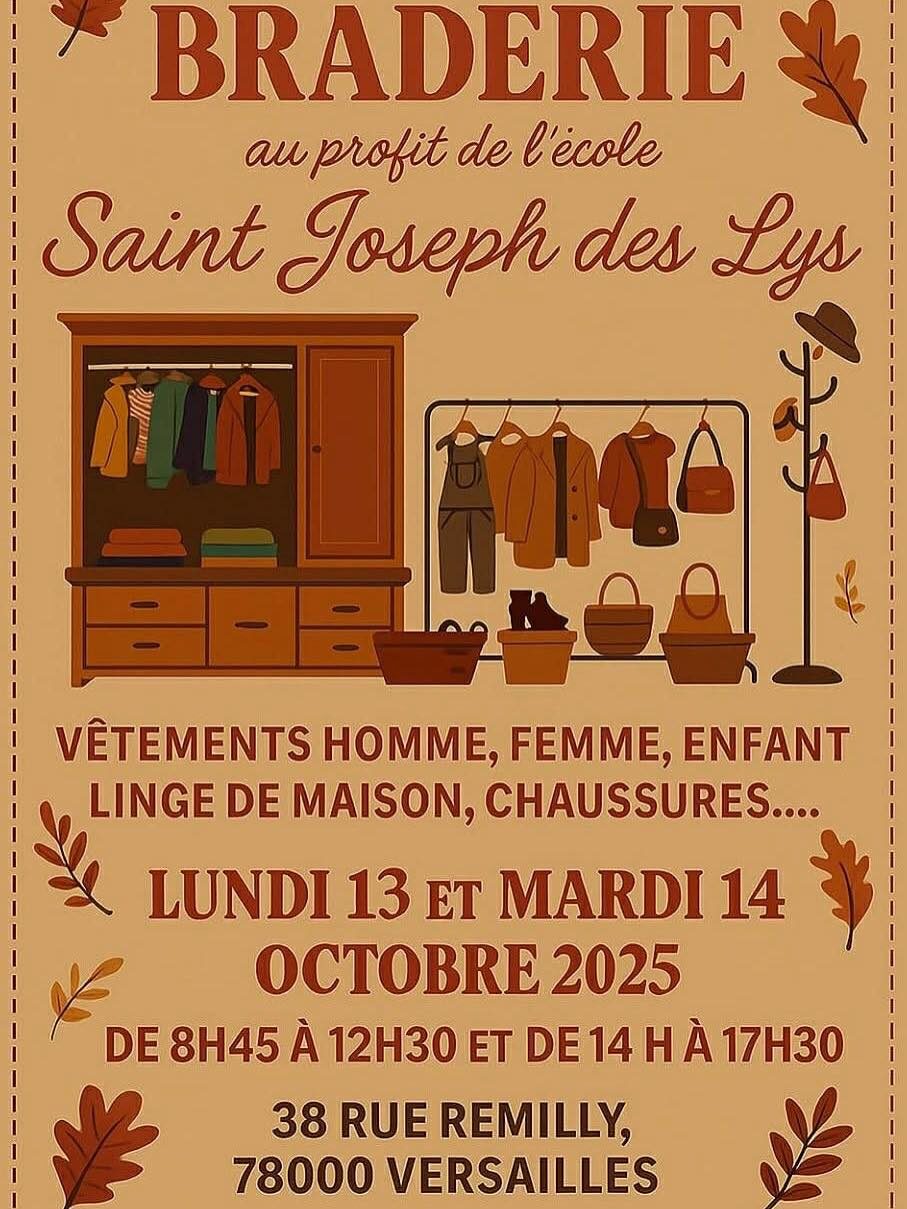 L’école vous invite à sa braderie d’automne (vêtements homme, femme ou enfants ; accessoires ; uniformes ; linge de maison…) qui aura lieu les lundi 13 et mardi 14 octobre 2025.