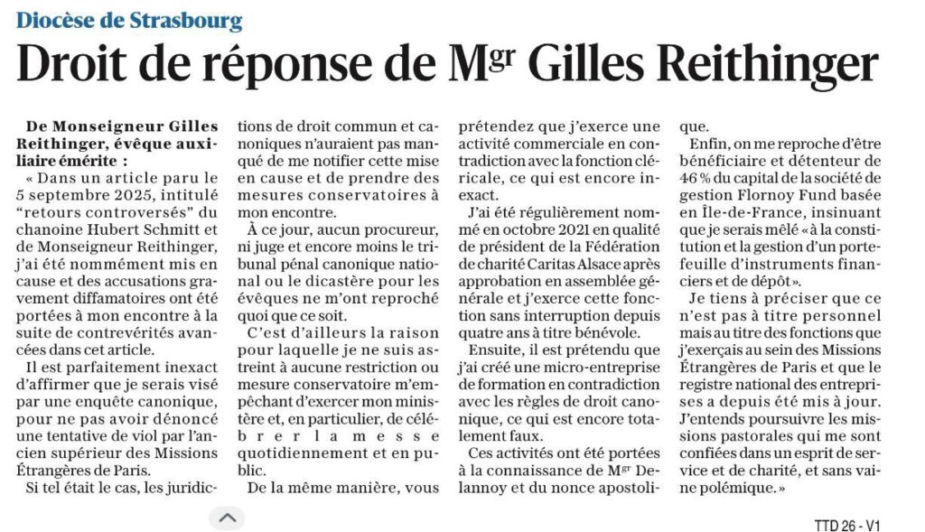 Dans un article paru le 5 septembre 2025, intitulé “retours controversés” du chanoine Hubert Schmitt et de Monseigneur Reithinger, j’ai été nommément mis en cause et des accusations gravement diffamatoires ont été portées à mon encontre à la suite de controverseurs avant la rédaction de cet article.