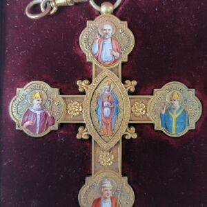 De rares croix de chanoines du chapitre cathédral de Monaco (lot 36) et de Bayeux (lot 30) font aussi partie de la vente ; celle de Bayeux est ainsi décrite : « Belle CROIX PECTORALE DE CHANOINE du chapitre de Bayeux en vermeil – à décor émaillé à l’avers, centré de la Vierge à l’enfant, assise sur son trône, les médaillons figurant des Saints (Saint Clément, Saint Exupère, Saint Regnobert, Saint Léon le Grand). – au revers ciselé et argenté, centré de la figure de Saint Pierre avec les clef et armoiries dans les médaillons (Léon XIII en haut, chapitre de Bayeux à gauche, ancien chapitre de Lisieux à droite et Léon Amette en bas, les bras latéraux gravés des initiales H P (sans doute du récipiendaire) et de l’année 1900. Poinçon tête de Sanglier. Signé VALLEE. Poinçon des orfèvres Demarquet Frères sur la bélière. Dans son écrin d’origine de la maison VALLEE ( 5 boulevard Saint Pierre à Caen) frappé aux armes du chapitre« .