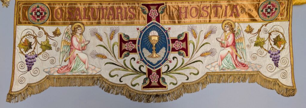 Mais aussi un dais blanc extraordinairement orné (lot 290) : « DAIS en tissu de soie moirée ivoire à décor richement brodé polychrome en peinture à l’aiguille, d’anges en orant de part et d’autre de médaillons accueillant un calice, l’Agneau biblique, le Pélican nourrissant ses petits et un ostensoir, parmi des roseaux, pampres de vignes et grappes de raisin. L’ensemble agrémenté de galons or et de franges. Doublure de soie jaune ».