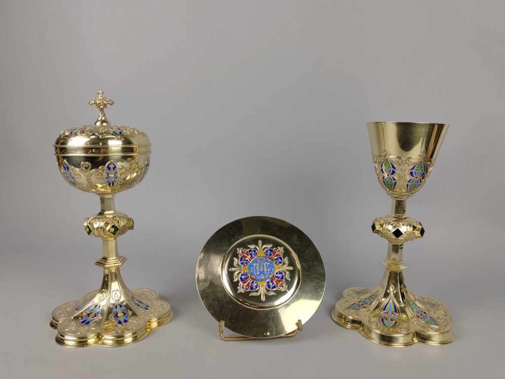 Le lot 13 est un ostensoir avec des émaux bleus de l’orfèvre parisien Paul Brunet, ainsi décrit : « très bel ostensoir en vermeil de style néogothique rehaussé d’émaux cloisonnés, améthystes et turquoises, la base polylobée soulignée de chimères en ronde bosse évoquant des arc-boutant soutenant le fût cannelé, la partie supérieure en forme de croix dont les bras et le centre sont soulignés de médaillons en émaux cloisonnés et entourée d’un riche décor ajouré de pampres de vigne« .