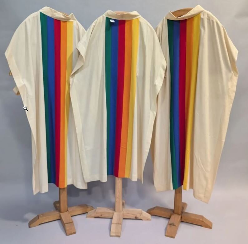 Lors de la vente d’art sacré d’Alençon de ce samedi 4 octobre à 14 heures, un des lots (246) est une série de trois chasubles créées par Jean-Charles de Castelbajac pour les JMJ en 1997. Ce qui permet de constater qu’il n’a très peu changé d’éléments pour concevoir la paramentique si décriée lors de la réouverture de Notre-Dame de Paris.