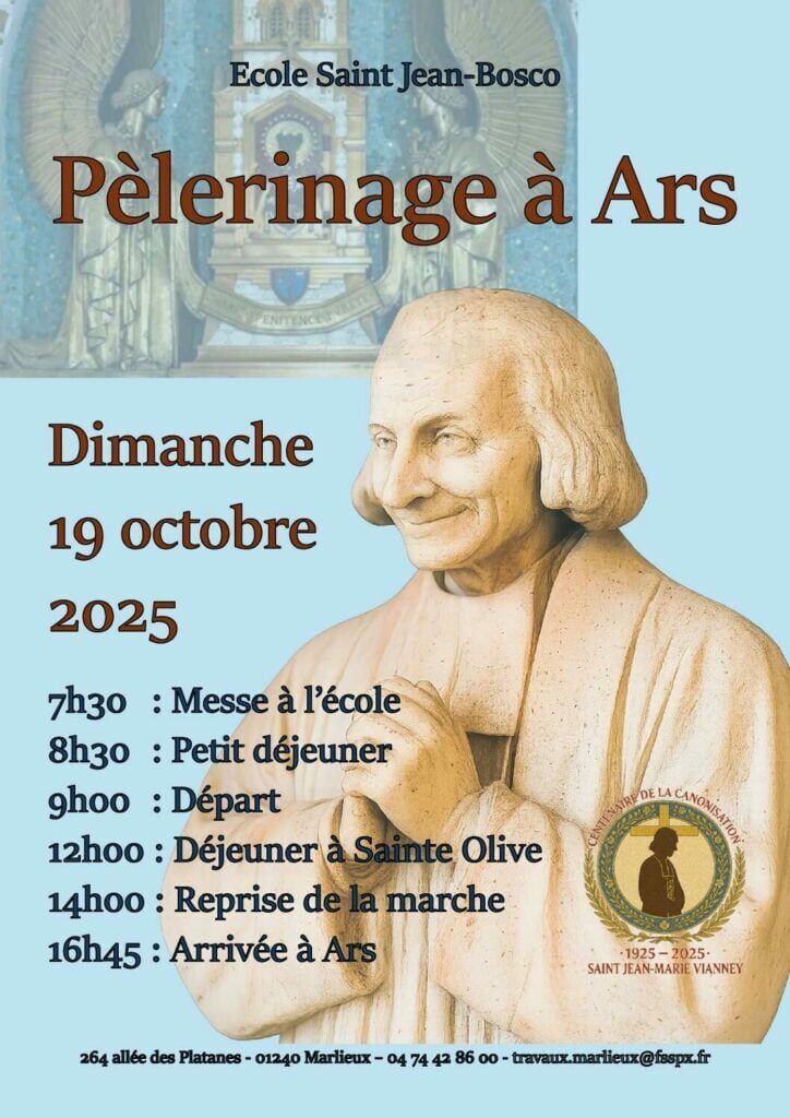 Accueil » Nos archives » Pèlerinage à Ars le 19 octobre (FSSPX) Summorum Pontificum Pèlerinage à Ars le 19 octobre (FSSPX) Pèlerinage en l’honneur du saint Curé d’Ars pour le centenaire de sa canonisation, organisé par l’école Saint Jean-Bosco (FSSPX) à Marlieux Ecole Saint Jean Bosco (Marlieux) Article précédentMonseigneur Gilles Reithinger corrigé par le Tribunal pénal canonique national Article suivantNouvelle carte d'identité de l'enseignement catholique de Lyon 3 octobre 2025