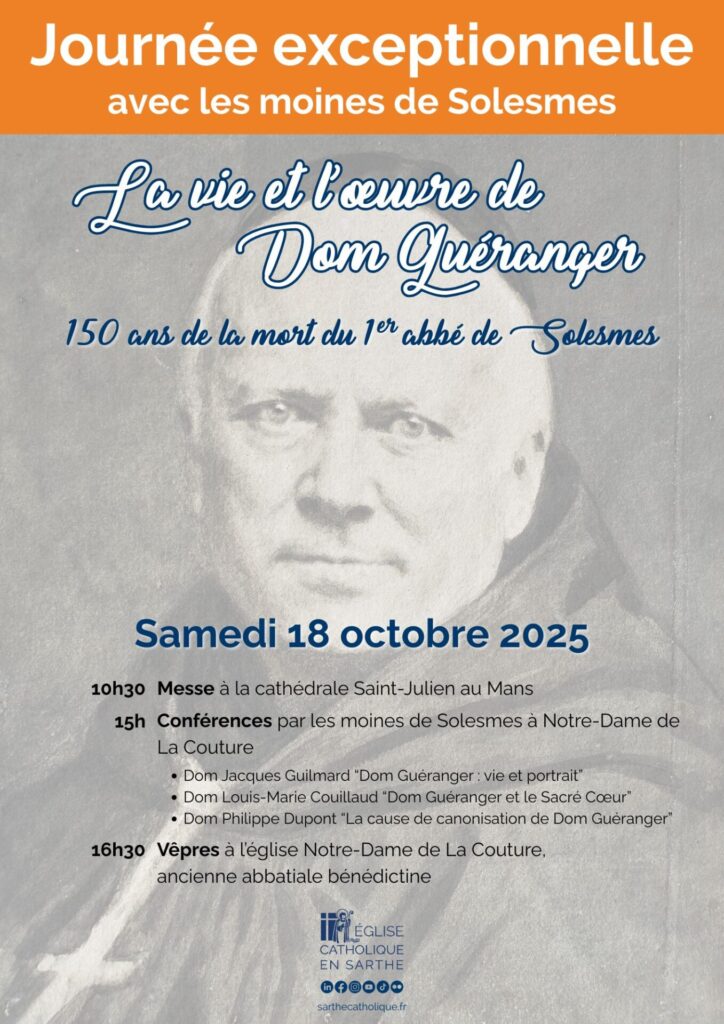 - les moines de Solesmes viendront au Mans pour une messe à la cathédrale à 10h30, conférences sur la vie et l’œuvre de Dom Guéranger, à 15h, à Notre-Dame de La Couture, vêpres à 16h30, à l’église Notre-Dame de La Couture, ancienne abbatiale bénédictine.
