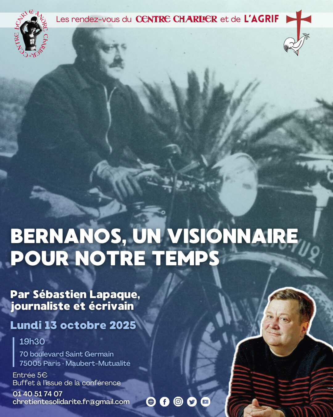 Accueil » Nos archives » [Agenda] Conférence sur Bernanos le 13 octobre à Paris Summorum Pontificum [Agenda] Conférence sur Bernanos le 13 octobre à Paris Le Centre Charlier et l’AGRIF organisent une conférence de Sébastien Lapaque sur Georges Bernanos le lundi 13 octobre à 19h30 au Centre Charlier (Paris). Centre Charlier Article précédentL'école Saint-Bernard (Villepreux) en chantier ! Article suivantMgr Verny : "l'Eglise doit marcher avec les victimes" 10 octobre 2025