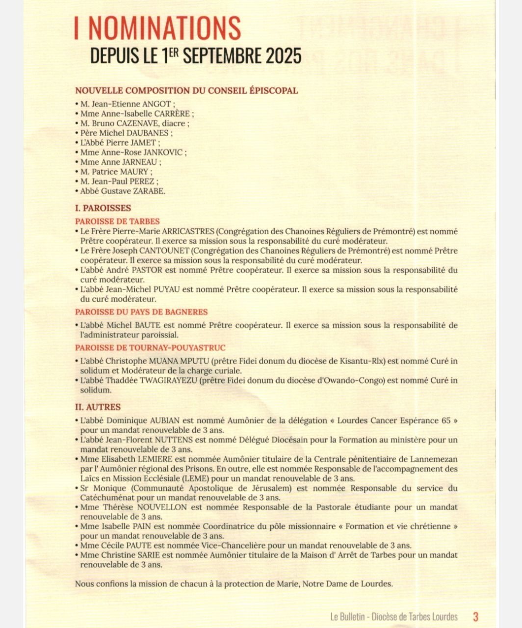 Accueil » Nos archives » Tarbes : les nominations diocésaines de la rentrée Église en France Tarbes : les nominations diocésaines de la rentrée Relevées dans le bulletin diocésain format papier d’octobre dernier; le conseil épiscopal a été renouvelé : Article précédent[Agenda] Congrès Mission à Paris le 8 novembre avec Notre-Dame de Chrétienté Article suivantPèlerinage Ad Petri Sedem: du monde à la Santissima Trinita dei Pelegrini 26 octobre 2025