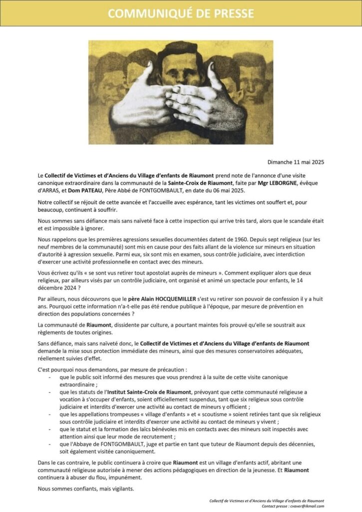 Après l’entrevue de cinq membres du collectif des victimes et anciens du village d’enfants de Riaumont avec Mgr Leborgne, évêque d’Arras et Dom Pateau abbé de Fontgombault, celui-ci dresse l’état des lieux par communiqué et adresse plusieurs demandes :
