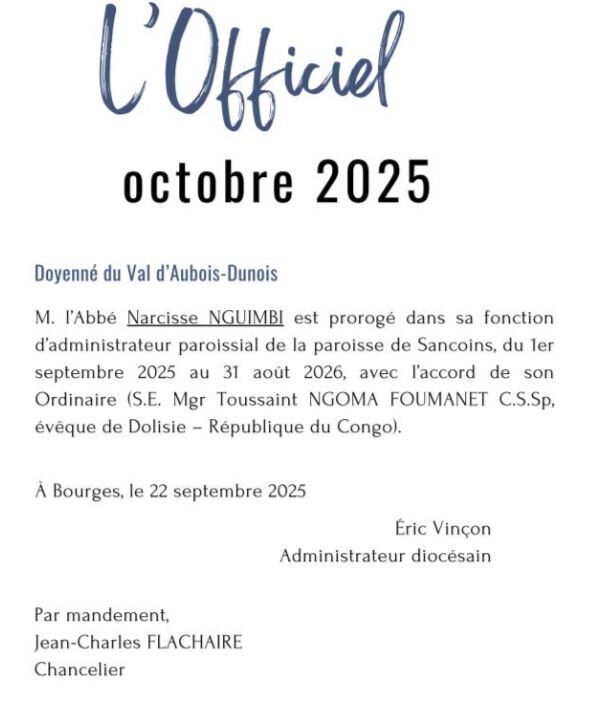 En octobre, l’administrateur paroissial de la paroisse de Sancoins a été prolongé dans ses fonctions