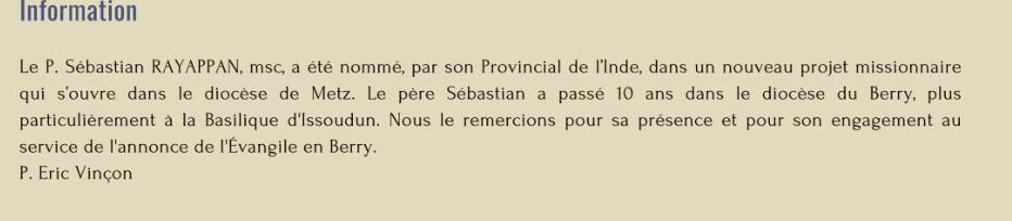 Le diocèse de Bourges, actuellement sans évêque, enregistre en septembre le départ du père Sébastien Rayappan après dix ans à Issoudun – il va à la paroisse d’Inglange dans le diocèse de Metz.