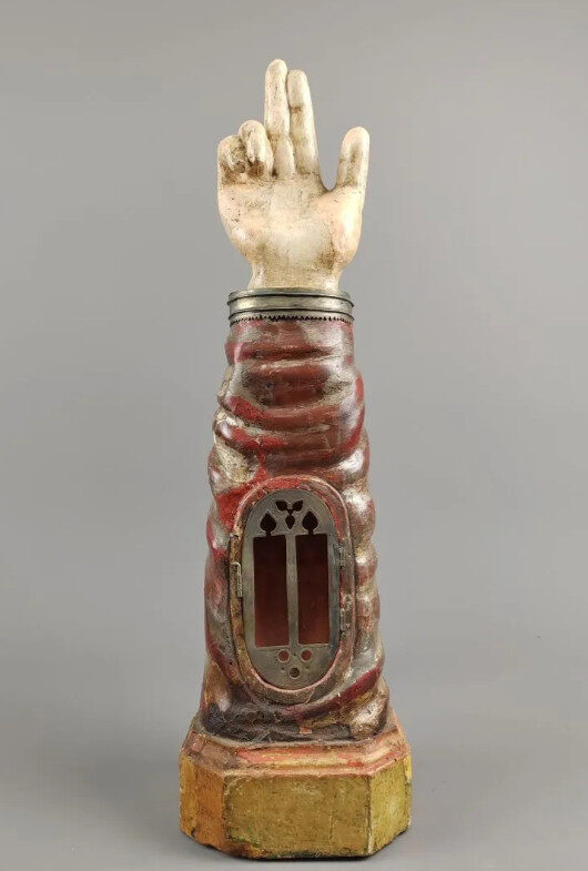 - un bras-reliquaire de la fin du XVe siècle (lot 1052), dont voici la description : « A la base du bras, large logette reliquaire ovale à fond rouge, le revers de la manche en cuivre argenté est souligné d’un galon double se terminant par un motif en « dent de scie ». Socle à moulurations à pans. Quelques manques et éclats de polychromie, la petite porte en cuivre argenté au décor ajouré de deux lancettes trilobées en forme de coeur et d’un motif trois feuilles est une restauration postérieure. FRANCE fin XVème siècle début XVIème siècle«