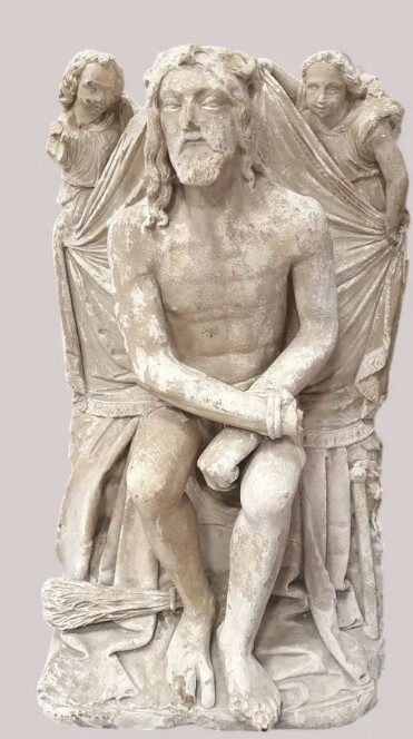 - un Christ de Pitié champenois mi-XVIe (lot 1130) en calcaire – il a donc échappé aux fureurs destructrices des Guerres de Religion.