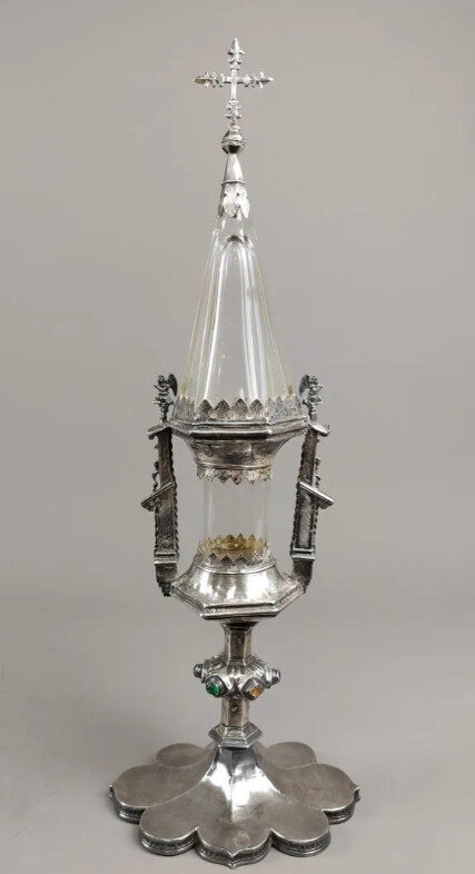 - une monstrance reliquaire en cristal et argent, d’Espagne, du XVe siècle (lot 1049), ainsi décrite : « L’ampoule cylindrique est enchâssée dans deux douilles hexagonales denticulées accostées de deux pinacles surmontés de deux anges. Flèche en cristal sommée d’une croix en argent. Tige de section hexagonale à noeud médian godronné rehaussé de cabochons de pierres de couleur dans des losanges. Repose sur un piédouche polylobé alternant accolades et lobes arrondis« .