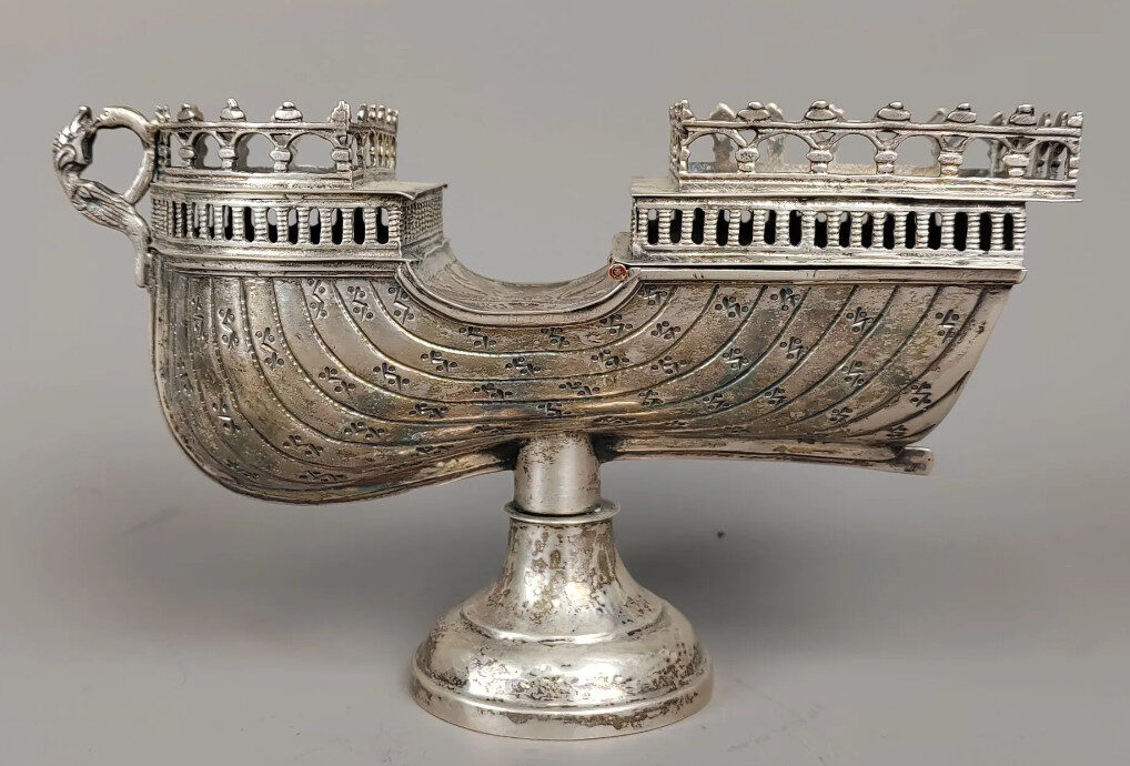 - une navette à encens portugaise en forme de galion, réalisée au XIXe dans le style du XVIe, en argent (lot 1026), ainsi décrite : « le corps représentant une coque finement gravée. Les châteaux avant et arrière sont ornés de motifs de feuillages au repoussé en fort relief et d’un bastingage ajouré. La proue, d’un motif zoomorphe Repose sur un fût balustre et piédouche« .