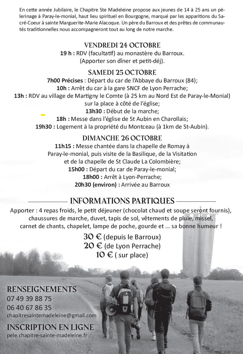 Accueil » Nos archives » Pèlerinage de rentrée du Chapitre Sainte Madeleine à Paray-le-Monial les 25 et 26 octobre Summorum Pontificum Pèlerinage de rentrée du Chapitre Sainte Madeleine à Paray-le-Monial les 25 et 26 octobre Le Chapitre Sainte-Madeleine propose aux jeunes de 14 à 25 ans un pèlerinage à Paray-le-Monial les samedi 25 et le dimanche 26 octobre. Renseignements et inscription (Chapitre Sainte Madeleine) Article précédentFin de vie : Mgr Christory écrit aux sénateurs de l'Eure-et-Loir Article suivant25 ans des Soeurs Franciscaines du Christ Roi (USA) 18 octobre 2025
