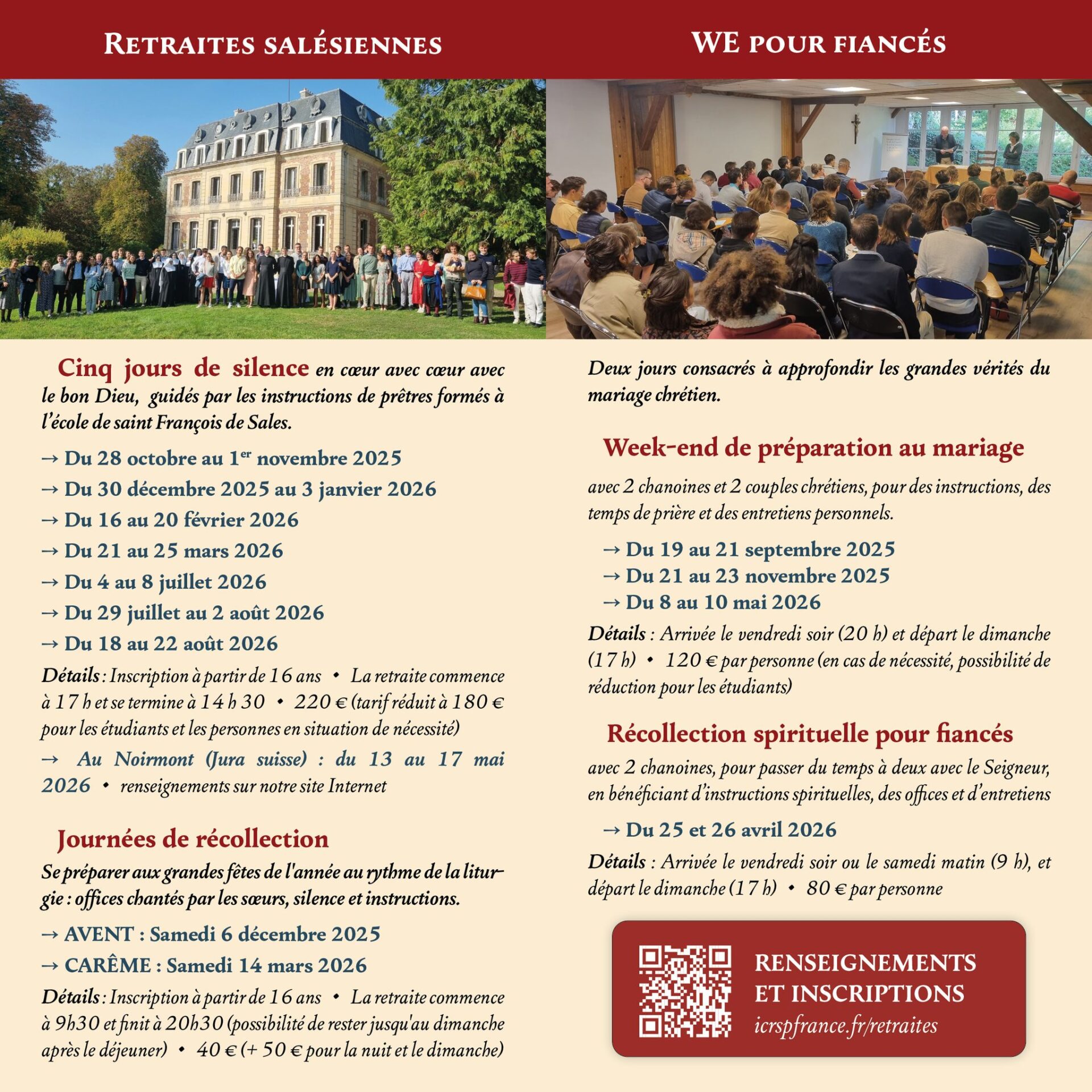 Accueil » Nos archives » Retraites spirituelles avec l’Institut du Christ Roi Summorum Pontificum Retraites spirituelles avec l’Institut du Christ Roi L’Institut du Christ Roi propose de nombreuses retraites dans les prochains mois (La plupart du temps en sa maison Notre-Dame de la Délivrance à Loisy (60)) : Renseignements ICRSP France Article précédentSaint-Stanislas : encore un prêtre auteur d'abus curé de plusieurs paroisses Article suivantMarché de Noël 2025 : Ecole Saint Martial (Limoges) les 21 et 22 novembre 27 octobre 2025