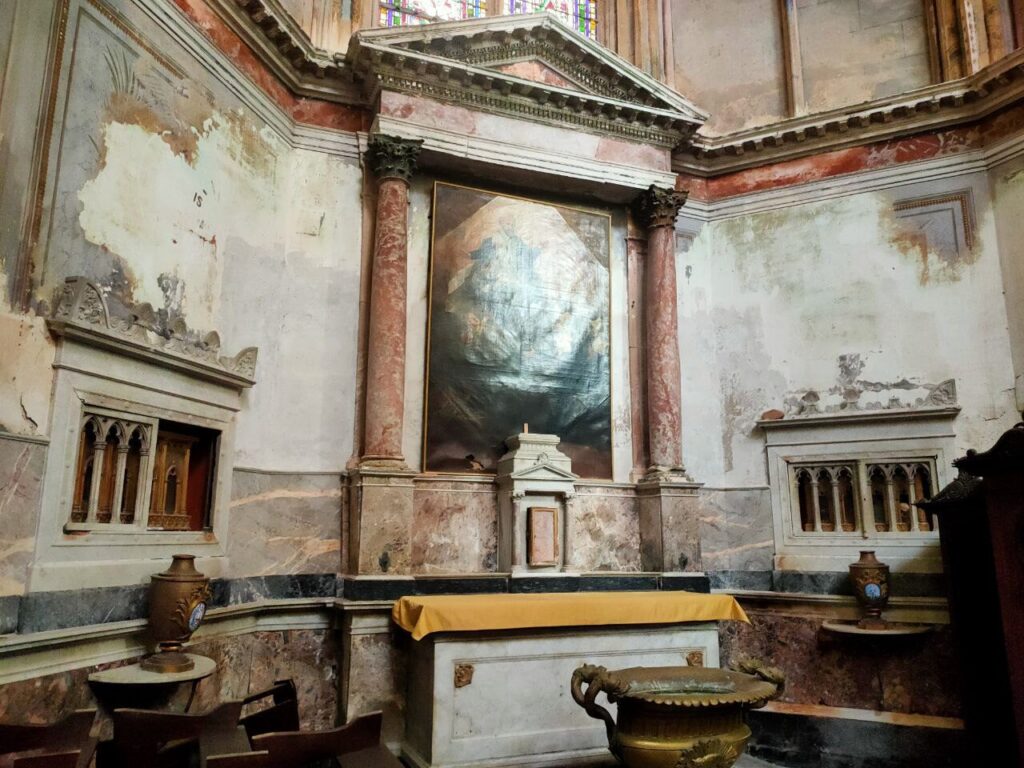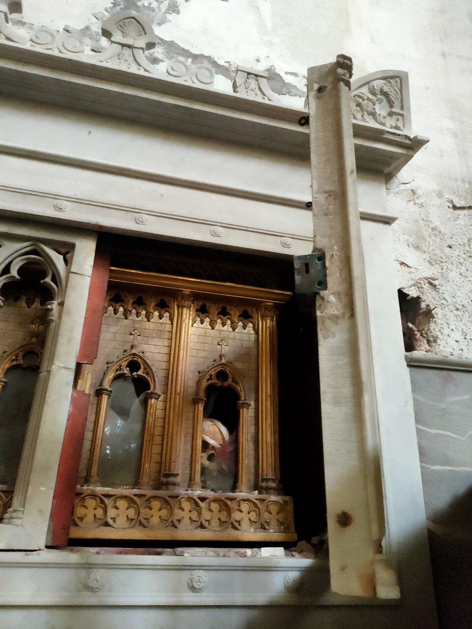 Dans telle chapelle du déambulatoire sud, un évêque en prières attend le jugement dernier au milieu de fresques qui partent en lambeaux; dans une autre, un buste fier se dresse devant un mur si décati que les briques paraîssent. Et juste à côté, dans la chapelle saint Vincent de Paul, les armoires en marbre des reliquaires baillent, les vitres sont brisées, laissant voir un crâne qui n’attend qu’un voleur pour prendre l’air – sur les réseaux sociaux et internet, les crânes et autres ossements sont en vente malgré l’article 16 du code civil sur l’indisponibilité du corps humain, et atteignent plusieurs milliers d’euros.