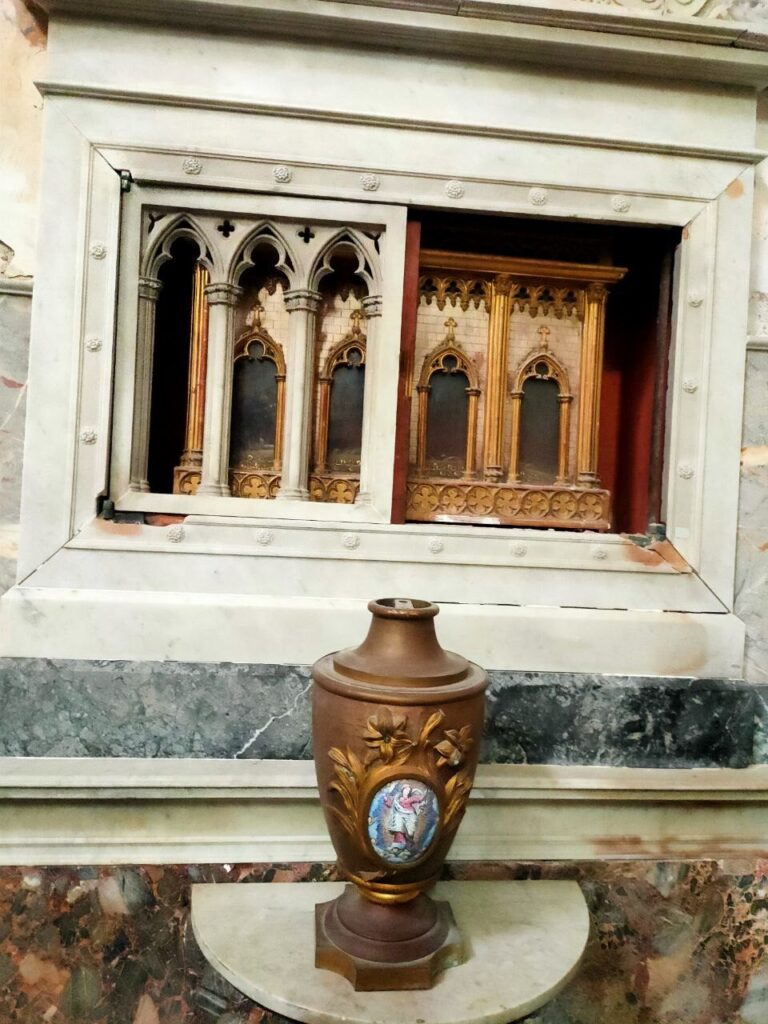 Les reliques dans les armoires ne sont pas indiquées, mais une étiquette avec des pleins et des déliés dans le placard à balais de la chapelle apprend au visiteur curieux qu’il s’agit de reliques de saint Vincent de Paul et saint Augustin.