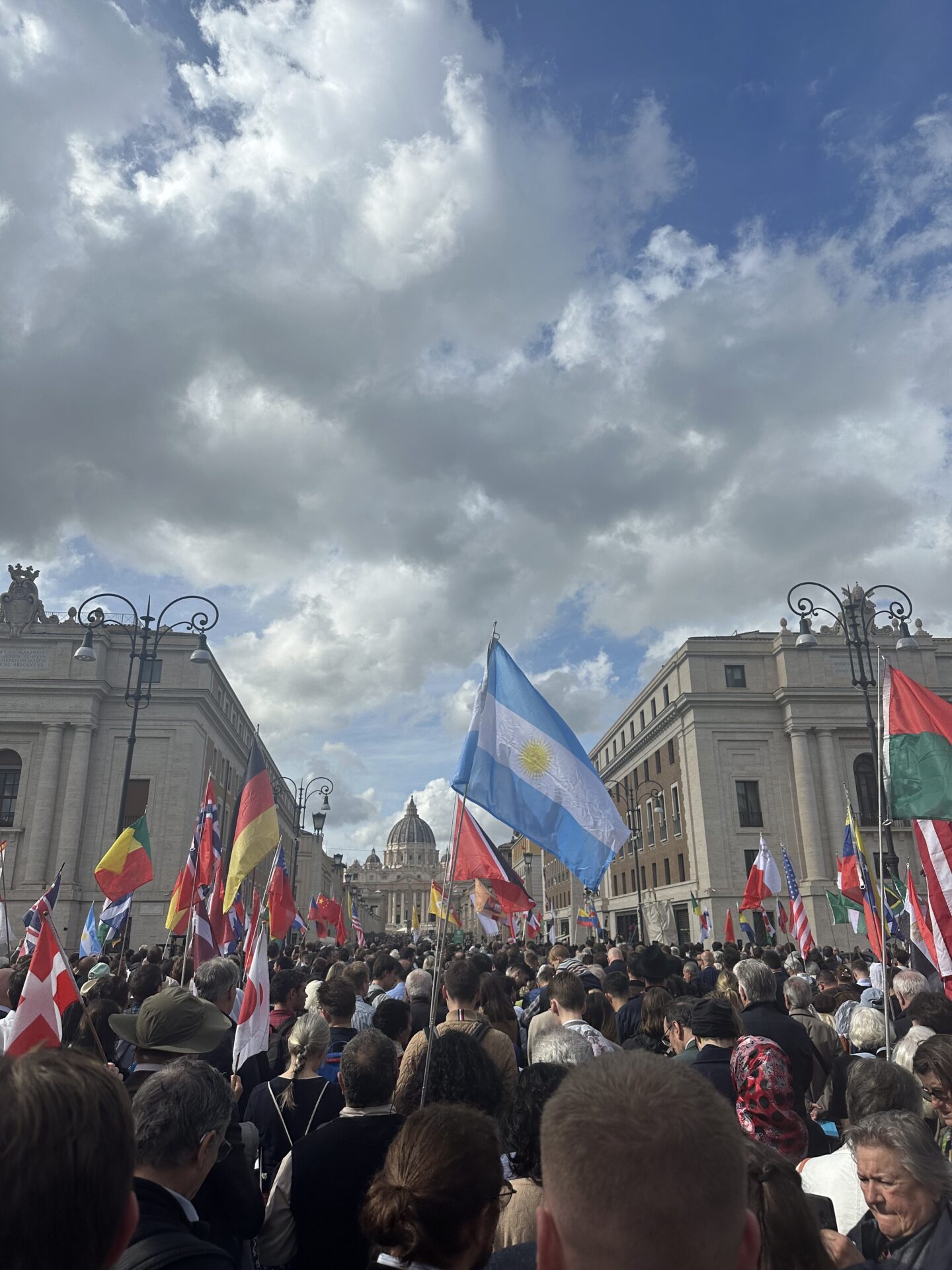 Les pèlerins sont partis de la basilique San Celso e Giuliano pour franchir le pont Saint-Ange et arriver à la via della concilliazione qui est juste en face du parvis de Saint-Pierre de Rome. Il y a beaucoup de fidèles venus de différents pays.