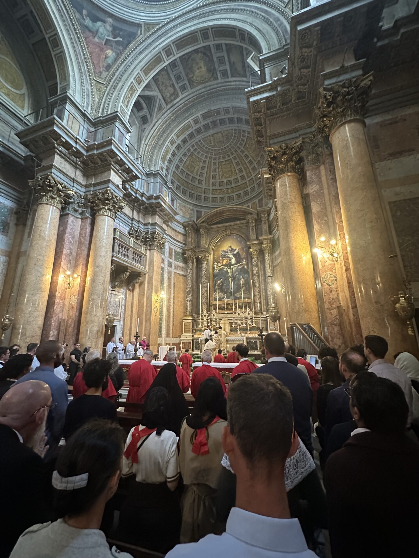 Il y avait du monde à la messe de clôture du Pèlerinage Ad Petri Sedem célébrée à la Santissima Trinità dei Pellegrini ce dimanche à onze heures. La cérémonie a duré plus d’une heure et demi. La messe était dite par l’abbé Brice Meissonnier de la Fraternité Saint-Pierre qui est le recteur de cette église romaine. Un message, lu notamment par l’abbé Barthe, a rappelé la confiance qui sied dans l’attachement à la messe traditionnelle.