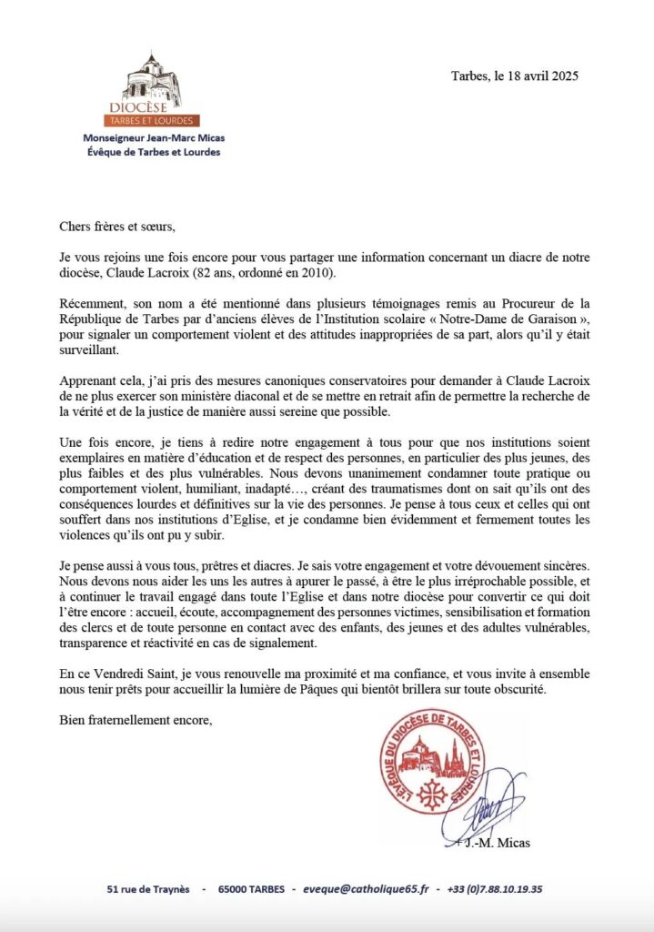 Après les nominations à trous, à compléter lorsque les effectifs pastoraux seront trouvés, le diocèse de Mgr Micas – Tarbes et Lourdes – vient d’inventer la suspension qui ne l’est pas vraiment, puisque le diacre suspendu célèbre « au coup par coup » au point que les paroissiens sont confus de le retrouver régulièrement dans des messes. Il s’agit d’un diacre de 82 ans, Claude Lacroix, dit « le Crabe », mis en cause par dix anciens élèves au printemps pour des faits de violence à Notre-Dame de Garaison, établissement où il a passé 69 ans de sa vie comme éducateur, surveillant puis bénévole, suspendu par Mgr Micas le 18 avril 2025 – Vendredi Saint – mais la décision est passée totalement inaperçue du fait de Pâques et du rappel à Dieu de feu le pape François.