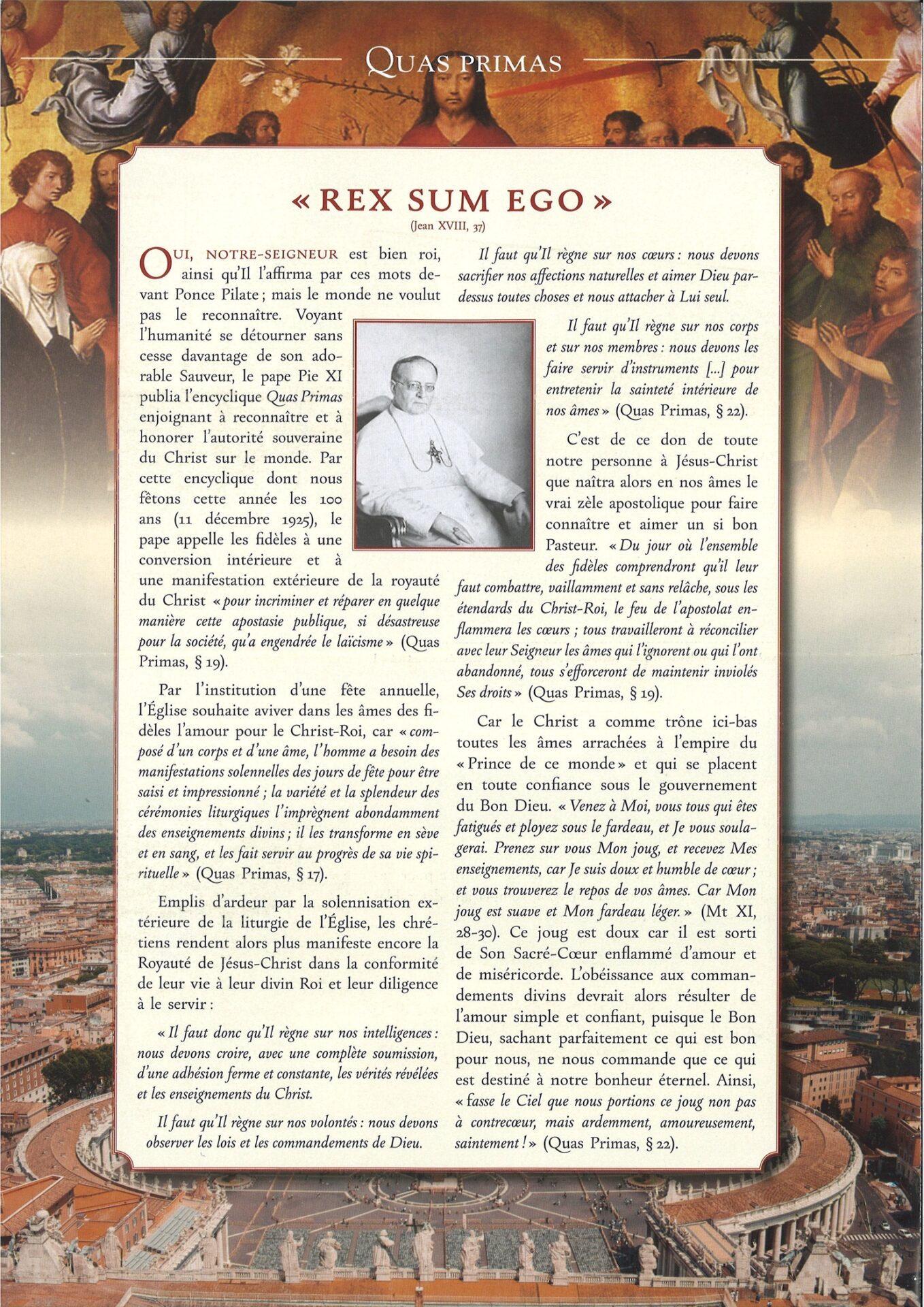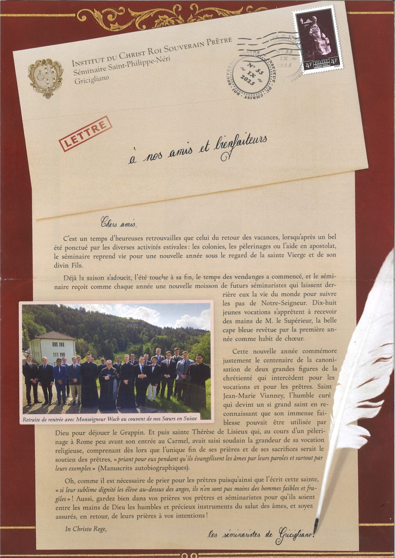 Le Séminaire Saint-Philippe Néri (Gricigliano), séminaire de l’Institut du Christ Roi Souverain Prêtre, publie sa lettre aux Amis et Bienfaiteurs de rentrée en donnant quelques nouvelles des derniers mois au séminaire (ordinations, chapitre…), des travaux réalisés au séminaire pendant l’été et consacre aussi un article au 100 ans de l’encyclique Quas Primas :