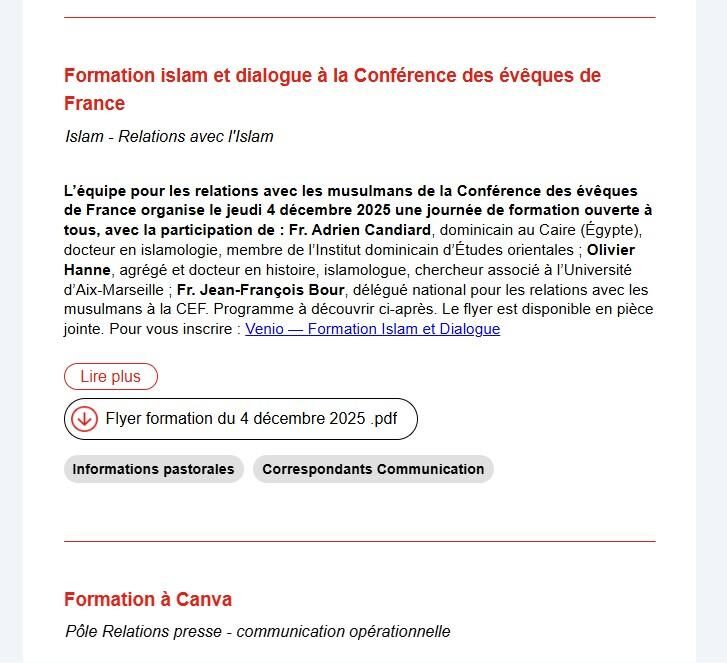 La formation du jeudi 4 décembre aura lieu à la Conférence des évêques de France avec : Fr. Adrien Candiard, dominicain au Caire (Egypte), docteur en islamologie et membre de l’Institut dominicain d’Etudes orientales; Olivier Hanne, agrégé et docteur en Histoire, islamologue et chercheur-associé à l’Université d’Aix-Marseille et Fr. Jean-François Bour, délégué national pour les relations avec les musulmans à la Conférence des évêques de France.