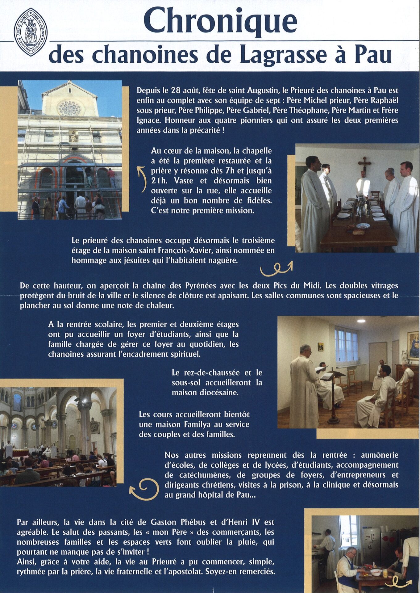 Accueil » Nos archives » Le Prieuré des Chanoines Réguliers à Pau Summorum Pontificum Le Prieuré des Chanoines Réguliers à Pau Les Chanoines Réguliers de la Mère de Dieu de l’abbaye Sainte-Maire de Lagrasse donnent des nouvelles de leur prieuré à Pau : Chanoines Réguliers de la Mère de Dieu (Lagrasse) Article précédentAbus sexuels du clergé: une question qui se pose en Italie Aucun article plus récent 11 novembre 2025