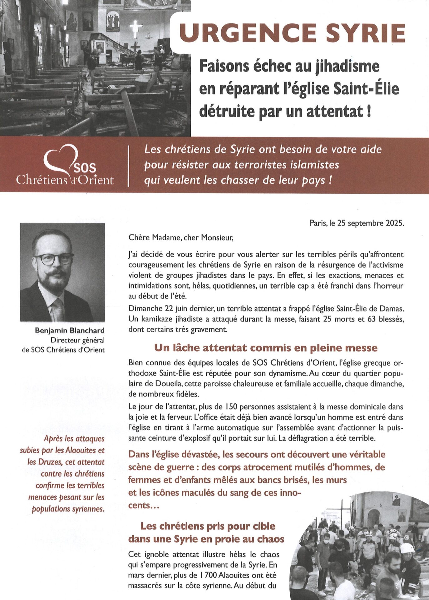 Il y a quelques semaines, SOS Chrétiens d’Orient lançaient un appel à soutien suite à l’attentat qui a détruit l’église Saint Eloi de Doueila. [Lire la chronique d’octobre 2025 de SOS Chrétiens d’Orient]