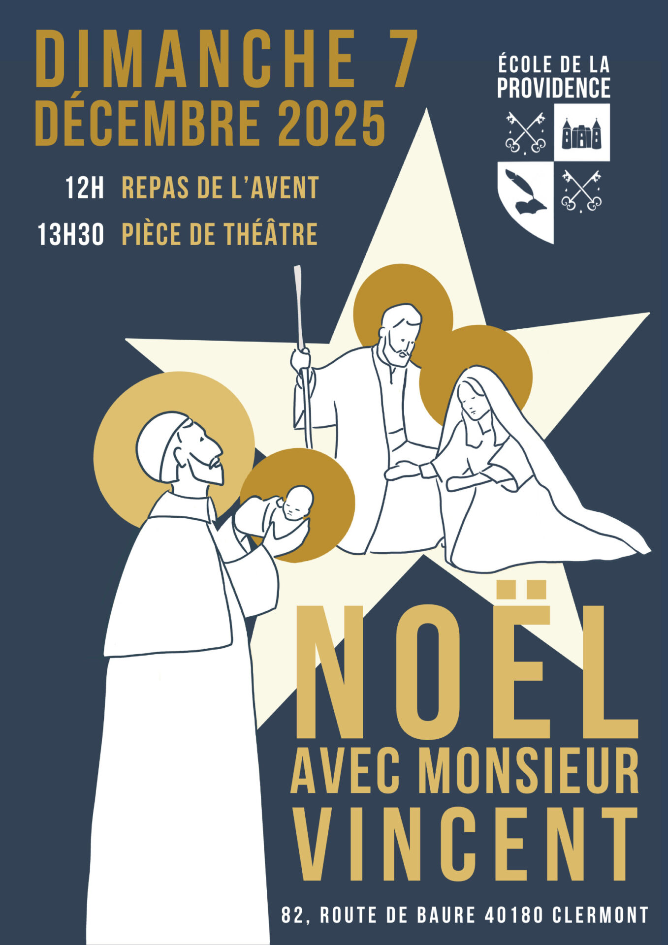 L’école vous invite à son repas de l’Avent le dimanche 7 décembre à 12h (à l’issue de la messe de 10h30) suivi de la pièce de théâtre « Noël avec Monsieur Vincent » :