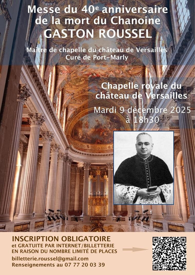 Une messe anniversaire pour le 40è anniversaire du rappel à Dieu de Chanoine Roussel (1913-1985) sera célébrée à la Chapelle Royale du Château de Versailles le mardi 9 décembre à 18h30 [Réservation impérative via le QR code] :