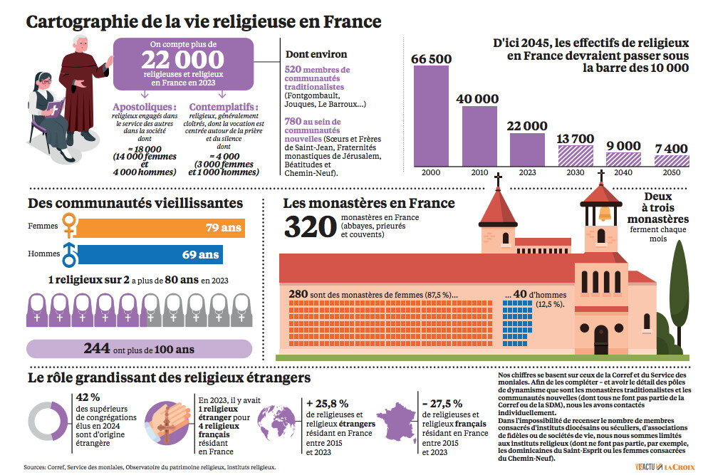 Selon La Croix, entre 2000 et 2023, le nombre de religieux et religieuses en France est passé de 66 000 à 22 000, et pourrait tomber sous la barre des 10 000 d’ici 2045.