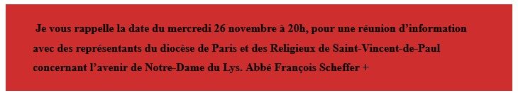 Un lecteur nous indique qu’une réunion aura lieu ce mercredi 26 novembre concernant l’avenir de la Chapelle Notre-Dame du Lys (Paris) :