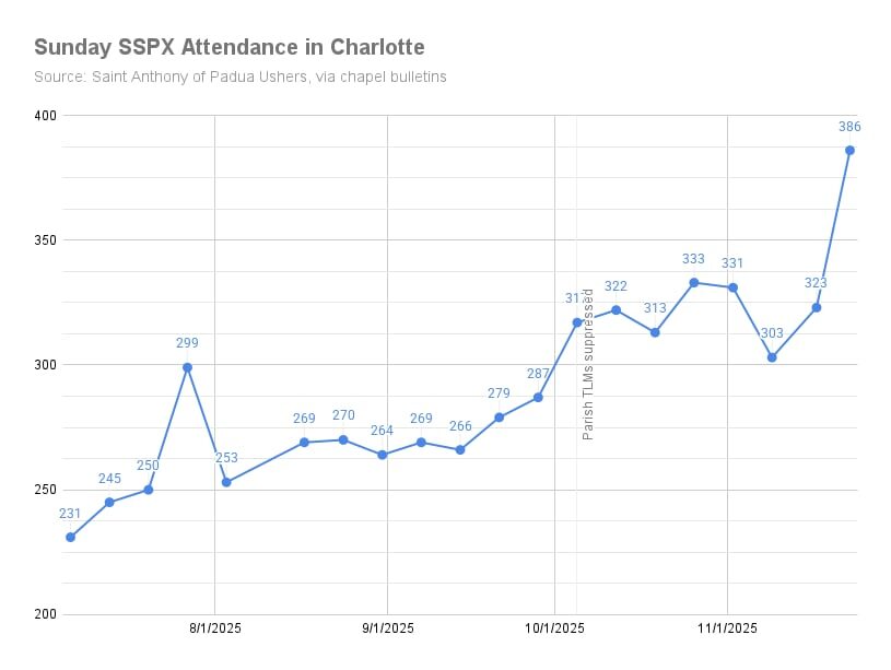 Mgr Michael Martin a donc annoncé en mai que les 4 messes traditionnelles (TLM )restantes dans le diocèse de Charlotte seraient supprimées et fusionnées en une seule nouvelle chapelle. Cette suppression a pris effet le 2 octobre. 625 fidèles ont assisté à la messe traditionnelle à Mooresville (seul lieu restant) alors qu’elle ne peut en contenir que 350. Mgr Martin a admis qu’elle n’était pas destinée à accueillir tous les fidèles attachés à la messe traditionnelle du diocèse.