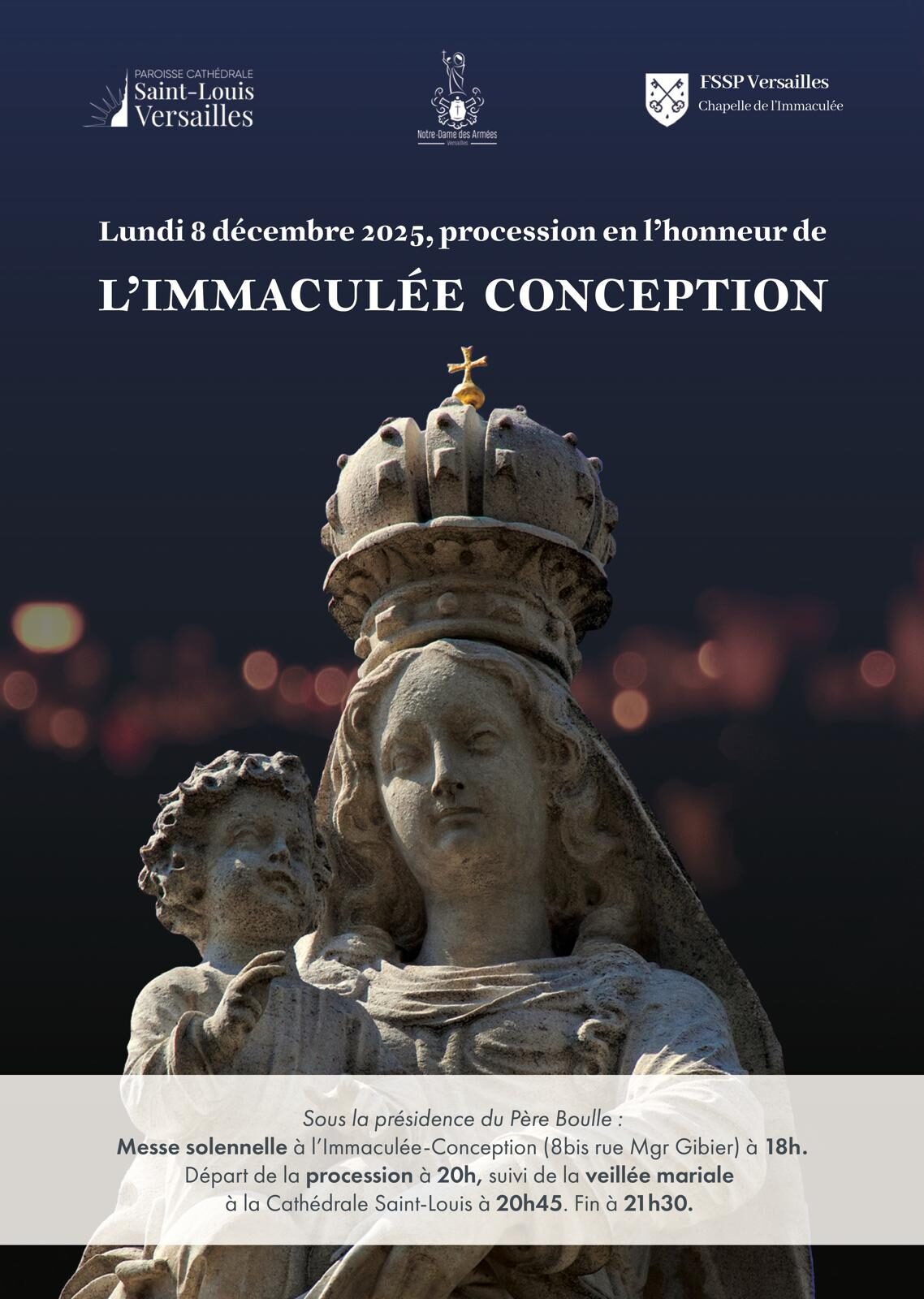 A Versailles, la procession de l’Immaculée Conception aura lieu le lundi 8 décembre. Elle réunira les paroissiens de la Chapelle de l’Immaculée, mais aussi les Paroissiens de Notre-Dame des Armées et de la Cathédrale saint-Louis.