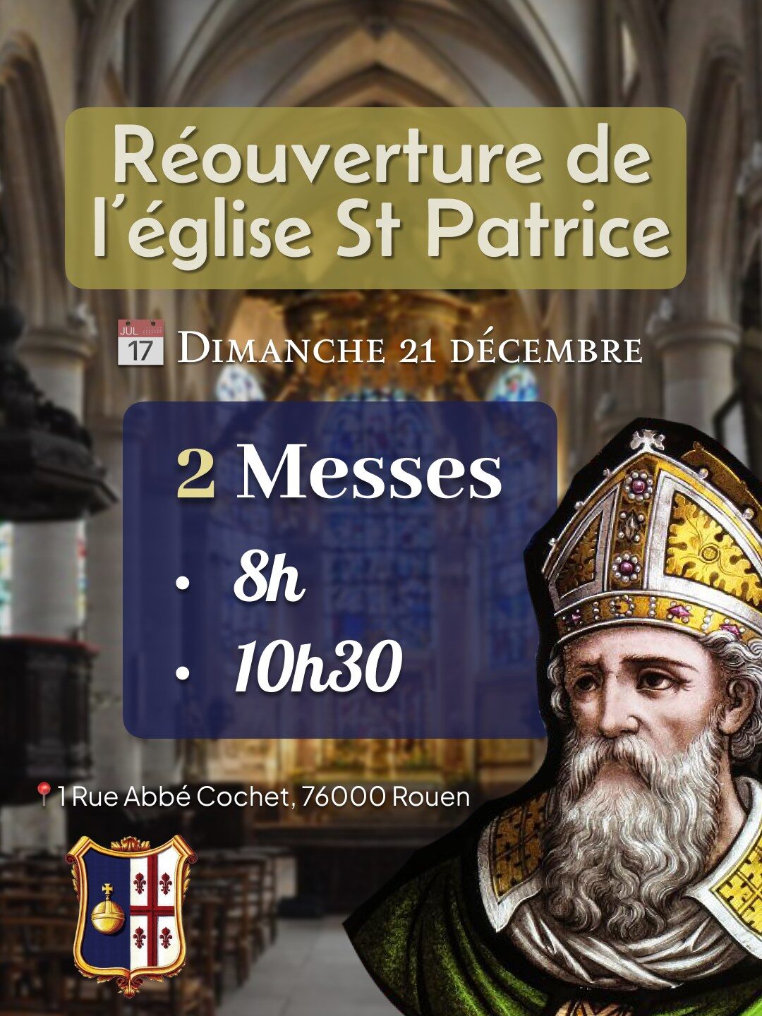 L’Institut Christ Roi – Rouen annonce la réouverture de l’église Saint-Patrice à Rouen après plusieurs mois de travaux. Depuis avril 2024, la messe traditionnelle était célébrée en l’église Saint-Joseph à Rouen :