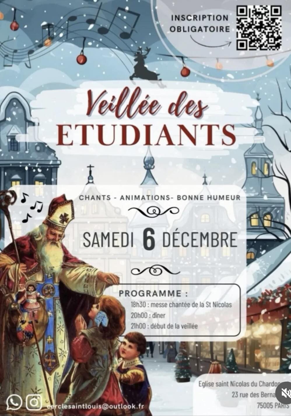 Accueil » Nos archives » Veillée des étudiants de Saint-Nicolas du Chardonnet (Paris) le 6 décembre Summorum Pontificum Veillée des étudiants de Saint-Nicolas du Chardonnet (Paris) le 6 décembre Un lecteur nous invite à diffuser cette invitation pour les étudiants parisiens le samedi 6 décembre : Saint-Nicolas du Chardonnet (Paris) Article précédentOrléans : un surveillant d'un lycée catholique mis à pied Article suivantRome: exclusion des femmes au diaconat entendu comme degré du sacrement de l’Ordre 4 décembre 2025